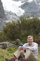 The guide book says that the track, which starts by a river and ends at the foot of a glacier, climbs steadily – for steadily read relentlessly. Half way up the track is a sign which reads “Caution. Track damaged ahead. Proceed with caution.” We did. We were however passed by younger Kiwis bounding up the track or running down. One family of 3 had stopped by the glacial river to see how cold the water was. They had a competition to see who could keep their hand in the longest. Duncan said they must be in training for the “Iron Man” competition and they did confess that the previous day they had done a 56km cycling trip. Duncan says that he now understands why the All Blacks seem to do so well at rugby. We even met a couple with a newborn baby who had already climbed to the top and were on their way down.